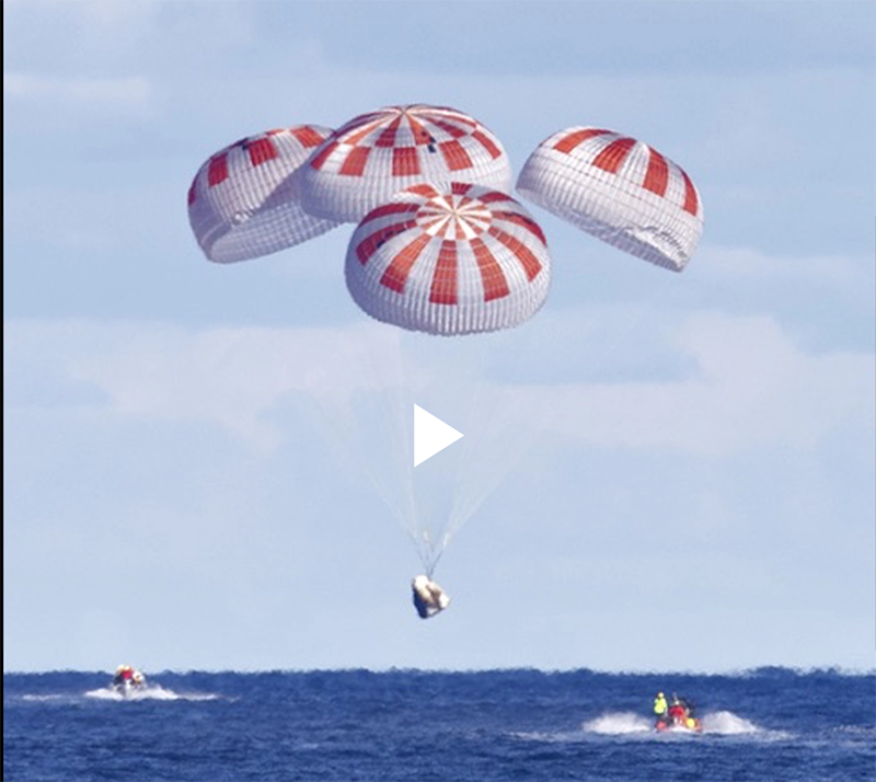 The Dragon spacecraft is equipped with two drogue parachutes to stabilize the spacecraft following reentry and four main parachutes to further decelerate the spacecraft prior to landing.